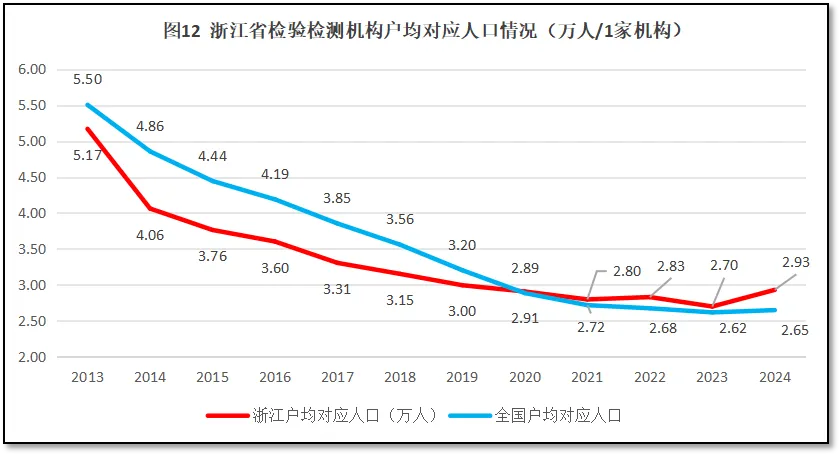 再来看浙江地区检验检测机构户均对应服务的人口数据。2024年末,浙江省常住人口6670万人,检验检测机构户均服务人口2.93万人,比全国平均数2.65万人略高。过去12年,浙江省检验检测机构户均对应的人口数量与全国的情况进行比较,如图12所示。