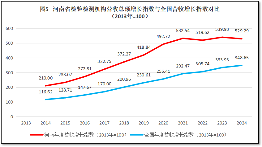 由上图可见,河南省检验检测机构营收总额增长指数一直保持着高于全国平均数的水平发展,曲线始终高于全国平均线。不过,2021年之后河南省检验检测机构营收增长指数基本上没有了增长,曲线变得平坦,与全国平均数的差距有所缩小,到2024年增长指数相差约为180左右。
