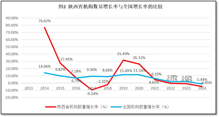 陕西省检验检测机构数量增长率与全国检验检测机构数量的增长率进行比较,如图2所示。